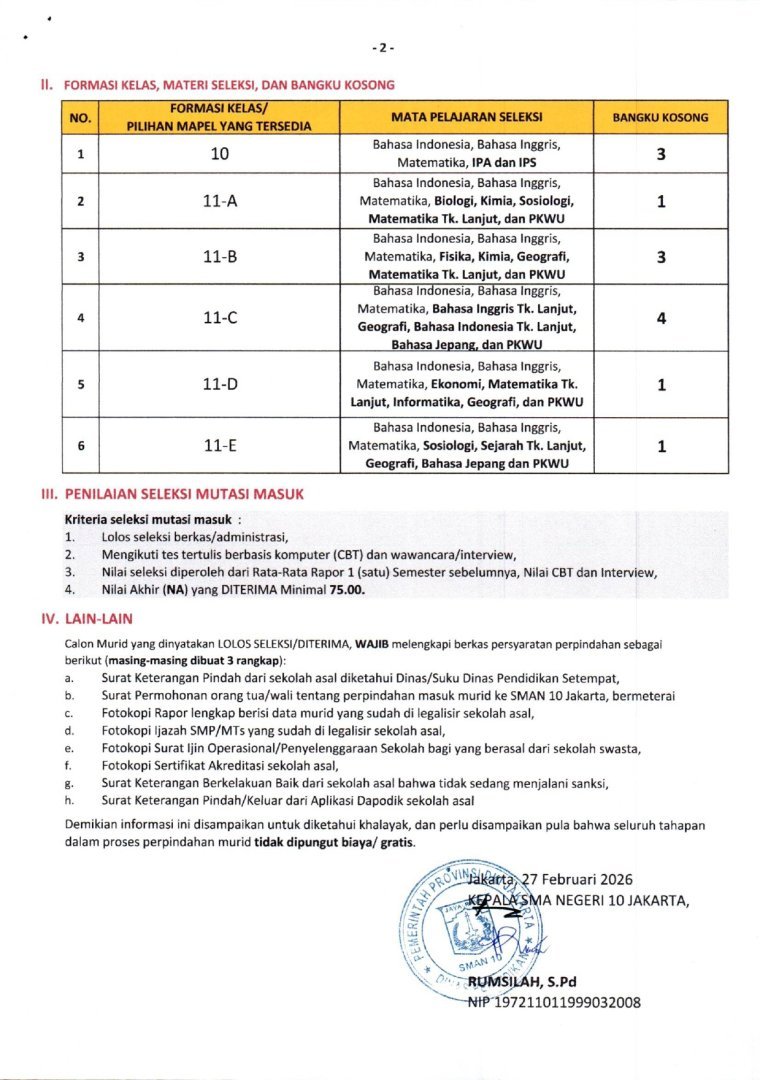 Menindaklanjuti Surat Edaran Kepala Dinas Pendidikan Provinsi Daerah Khusus Ibukota Jakarta Nomor 53/SE/2025 tentang Perpindahan Murid Semester Genap Tahap 2 Tahun Ajaran 2025/2026, dengan ini kami sampaikan informasi Penerimaan Perpindahan Masuk Murid Semester Genap Tahap 2 Tahun Ajaran 2025/2026 di SMA Negeri 10 Jakarta sebagai berikut :