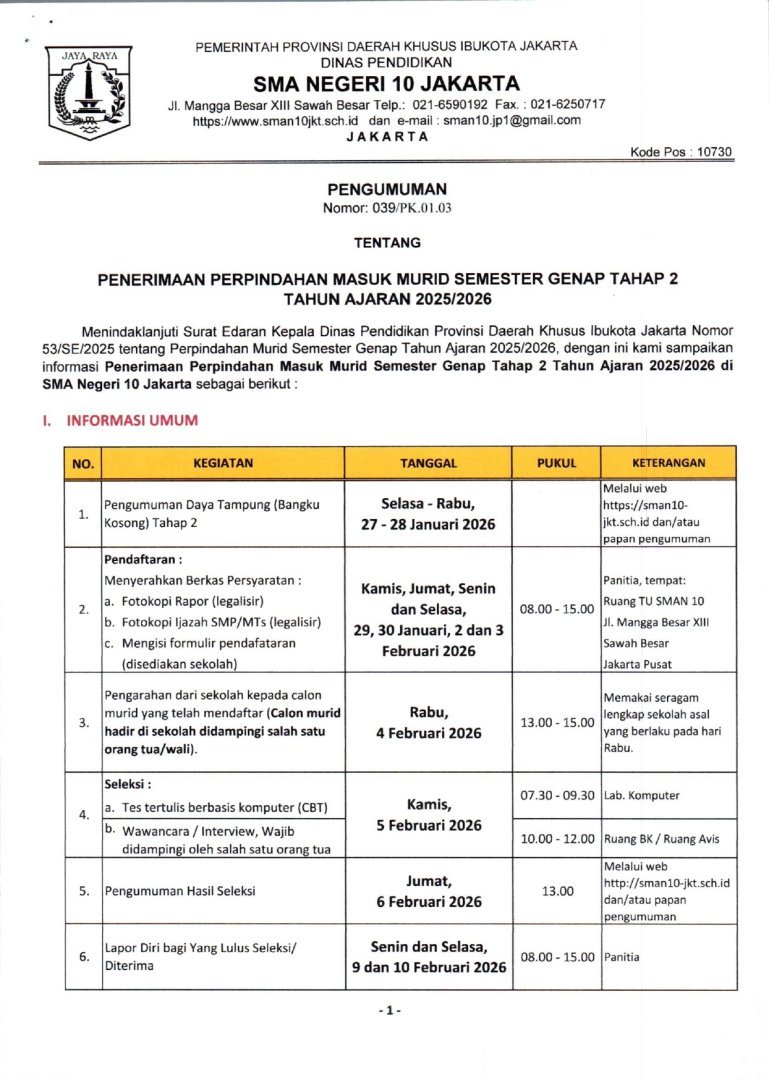 Menindaklanjuti Surat Edaran Kepala Dinas Pendidikan Provinsi Daerah Khusus Ibukota Jakarta Nomor 53/SE/2025 tentang Perpindahan Murid Semester Genap Tahap 2 Tahun Ajaran 2025/2026, dengan ini kami sampaikan informasi Penerimaan Perpindahan Masuk Murid Semester Genap Tahap 2 Tahun Ajaran 2025/2026 di SMA Negeri 10 Jakarta sebagai berikut :